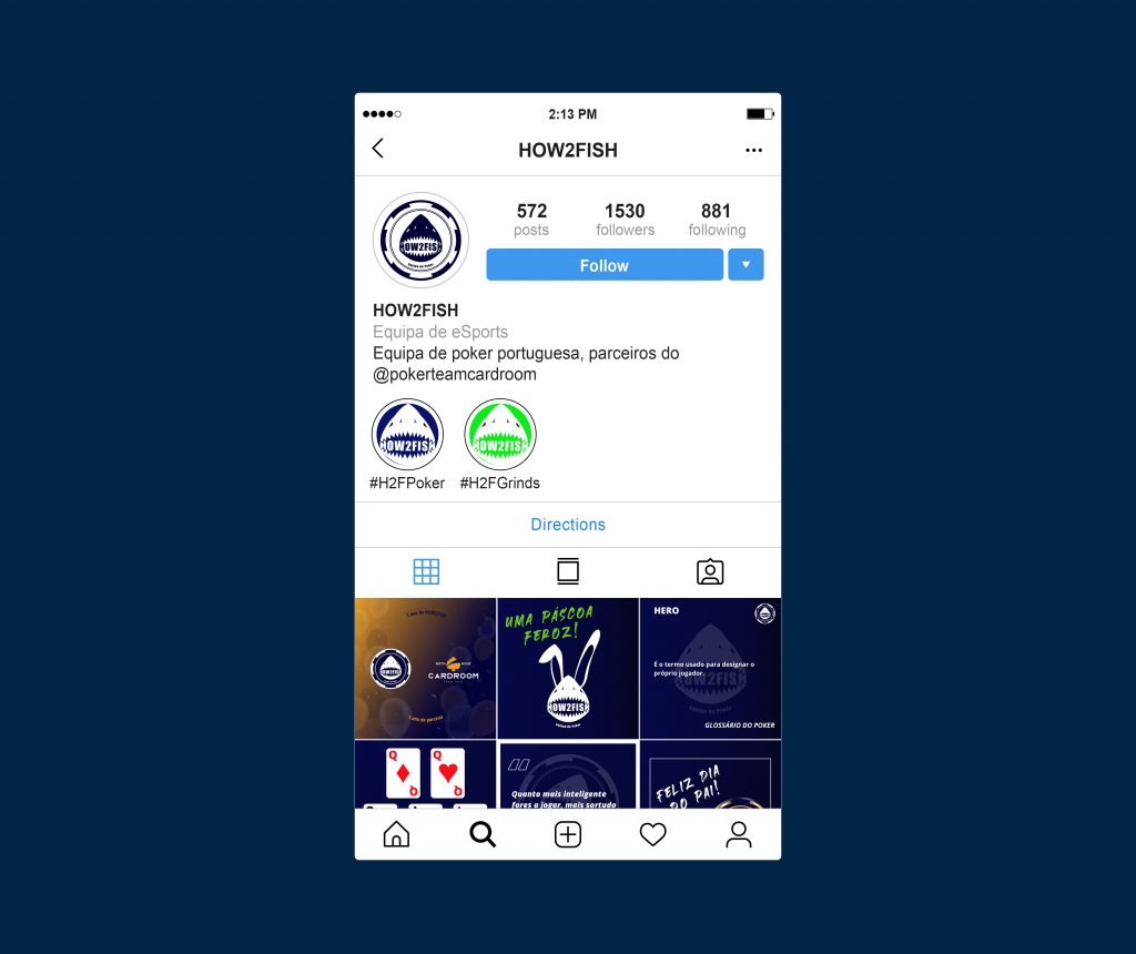 Criação de Conteúdos e Design para as Social Medias da HOW2FISH é direcionada a um público-alvo, maioritariamente, masculino e entre as faixas etárias dos 18-45 anos. A estratégia de comunicação foi pensada para distribuir conteúdo educativo (sobre poker, mas também sobre mindset e saúde). A comunidade do Poker valoriza e promove um estilo de vida saudável entre si. O poker é um jogo que requer muito estudo, concentração e dedicação de horas e é, por isso, fundamental que o jogador tenha as melhores condições para jogar (um bom setup, boa cadeira, etc.), bem como faça uma boa rotina de alimentação e sono. A partilha dos resultados dos jogadores da equipa, bem como de um TOP5 mensal eram assíduas por serem importantes para a motivação dos jogadores. Depois de quase 2 anos, à HOW2FISH foi deixado, essencialmente, um leque imenso de ideias para serem concretizadas e uma boa base de seguidores no instagram (cerca de 1500). Atualmente, a equipa passou por um processo de rebranding de forma a refrescar a imagem e torná-la mais competitiva.